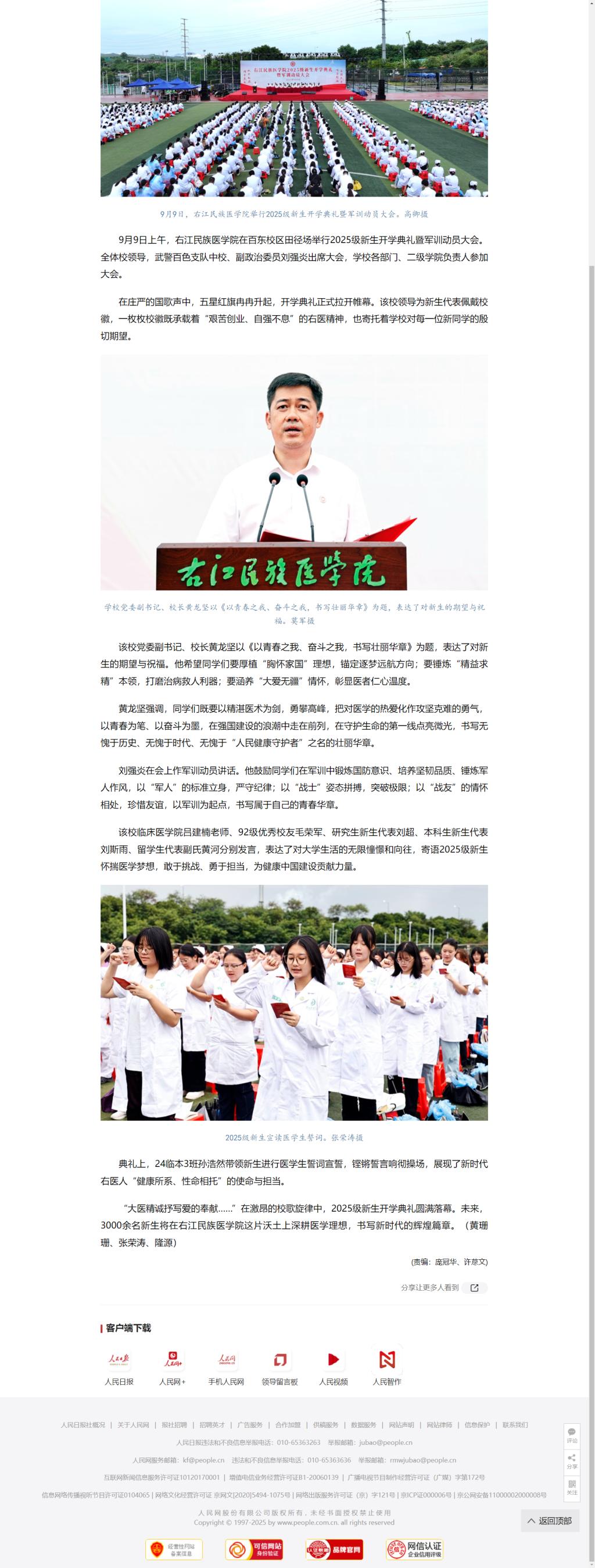 9月10日,人民网以《以青春之我、奋斗之我,书写壮丽华章》为题,报道了右江民族医学院举行2025级新生开学典礼暨军训动员大会。