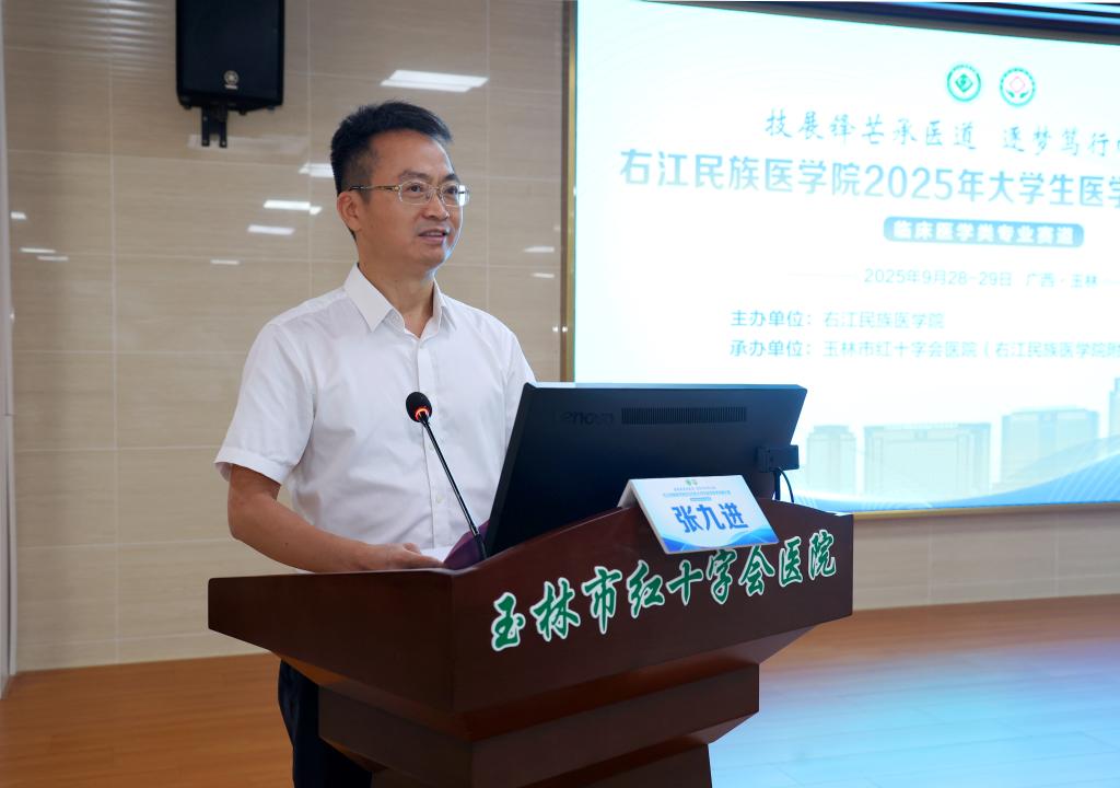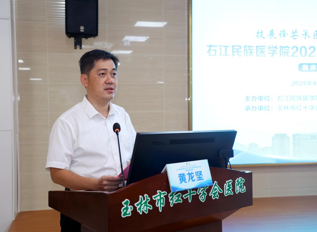 黄龙坚在开幕式上致辞并宣布右江民族医学院2025年大学生医学技术技能大赛开赛。黄龙坚指出,要以赛促学强本领,让赛场成为提升临床能力的“成长熔炉”,要以赛护航优服务,让保障成为赛事顺利的“坚实纽带”,要以赛立规守公正,让评判成为行业标准的“示范标杆”,通过大赛进一步激发师生重视临床实践、苦练过硬本领的热情,推动学校及各附属医院和教学实习医院的临床教学水平再上新台阶。