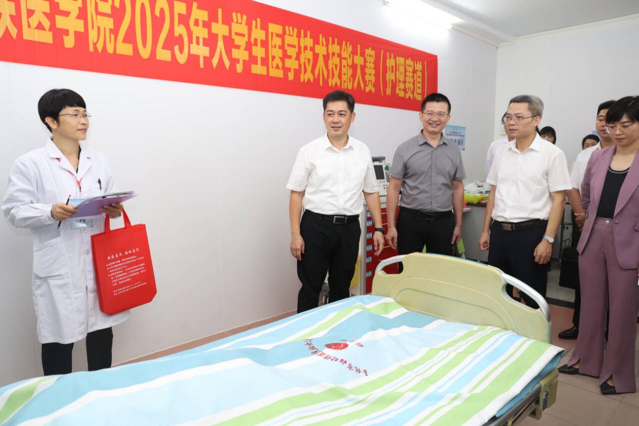 2025年9月29日,由我校主办、玉林市妇幼保健院承办的右江民族医学院2025年大学生医学技术技能大赛(护理赛道)决赛在玉林顺利举行。比赛开始前,校长黄龙坚带队到现场指导工作,查看了比赛场地和设施准备情况,听取了大赛组织工作的汇报。黄龙坚强调,专业技能竞赛是深化教育教学改革、加强专业内涵建设、提高本科教育教学质量的有效抓手,要以高度的使命感和责任感办好此次大赛,并通过“以赛促学、以赛促练、以赛促改”的方式,全面检验护理学专业实践教学成效,推动护理人才培养质量持续提升。