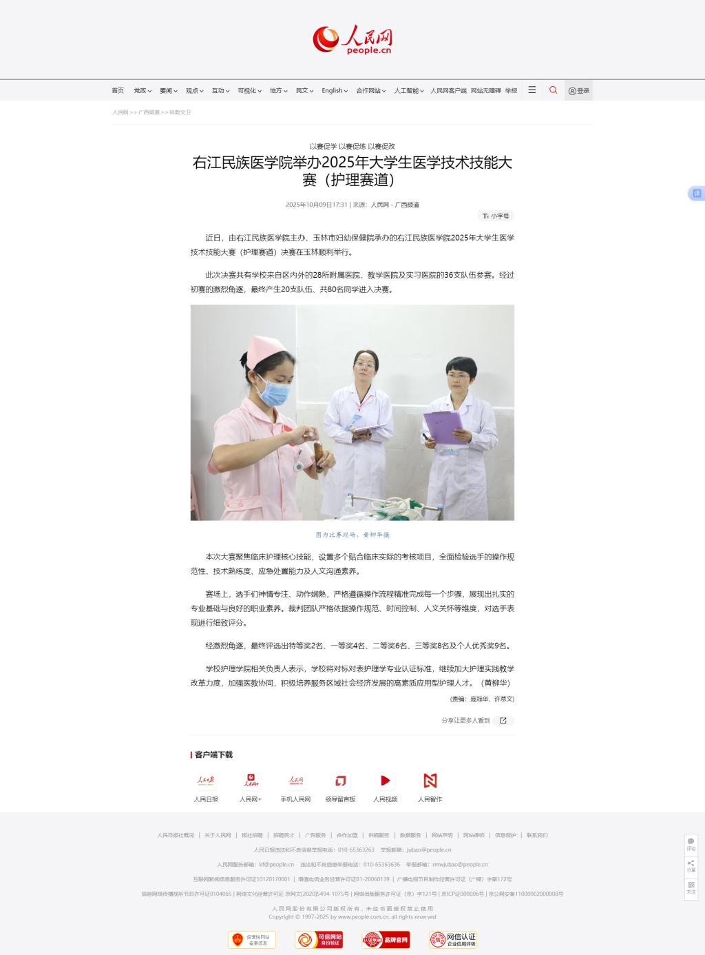 10月9日,人民网以《右江民族医学院举办2025年大学生医学技术技能大赛(护理赛道)》为题,报道了右江民族医学院2025年大学生医学技术技能大赛(护理赛道)决赛在玉林顺利举行。本次大赛聚焦临床护理核心技能,设置多个贴合临床实际的考核项目,全面检验选手的操作规范性、技术熟练度、应急处置能力及人文沟通素养。