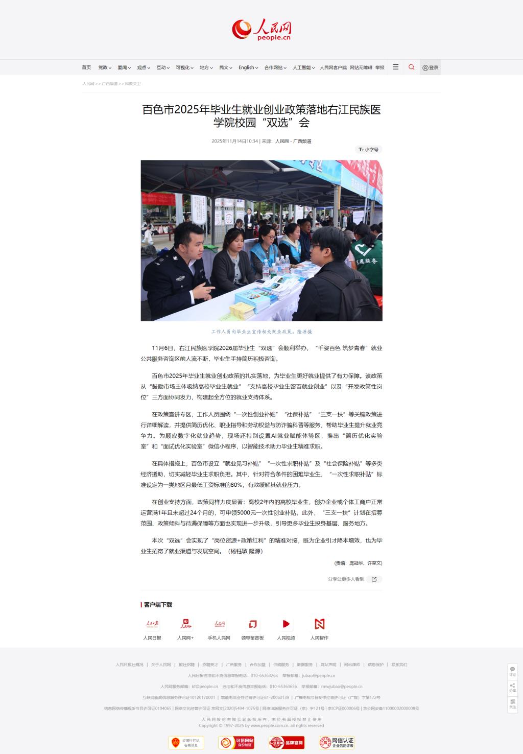 【媒体看右医】人民网:百色市2025年毕业生就业创业政策落地右江民族医学院校园“双选”会