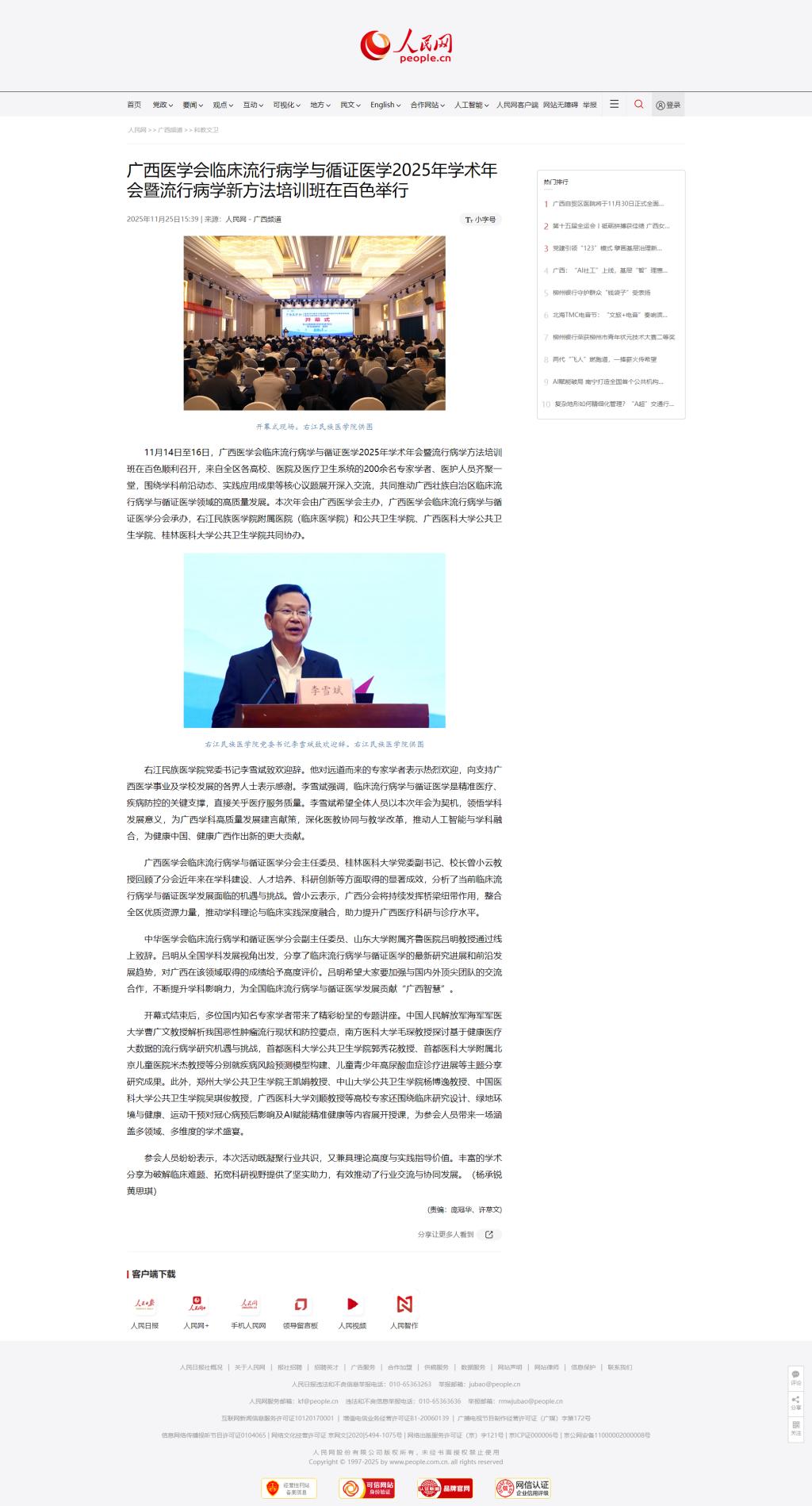 近日,人民网报道我校党委书记李雪斌出席在百色举行的广西医学会临床流行病学与循证医学2025年学术年会暨流行病学新方法培训班。李雪斌在开幕式上致欢迎词,希望全体人员以本次年会为契机,领悟学科发展意义,为广西学科高质量发展建言献策,深化医教协同与教学改革,推动人工智能与学科融合,为健康中国、健康广西作出新的更大贡献。
