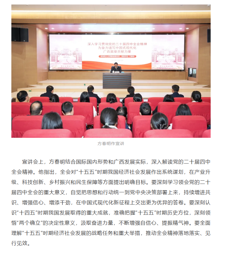 宣讲会上,方春明结合国际国内形势和广西发展实际,深入解读党的二十届四中全会精神。他指出,全会对“十五五”时期我国经济社会发展作出系统谋划,在产业升级、科技创新、乡村振兴和民生保障等方面提出明确目标。要深刻学习领会党的二十届四中全会的重大意义,自觉把思想和行动统一到党中央决策部署上来,持续增进共识、增强信心、增添干劲,在中国式现代化新征程上交出更为优异的答卷。要深刻认识“十四五”时期我国发展取得的重大成就,准确把握“十五五”时期历史方位,深刻领悟“两个确立”的决定性意义,汲取奋进力量,不断增强自信心、提振精气神。要全面理解“十五五”时期经济社会发展的战略任务和重大举措,推动全会精神落地落实、见行见效。
