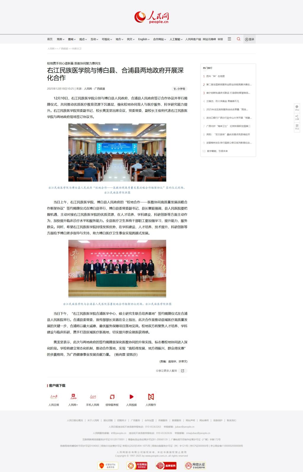 12月18日,人民网以《校地携手同心谱新篇 医教协同聚力惠民生 右江民族医学院与博白县、合浦县两地政府开展深化合作》为题,报道我校分别与博白县人民政府、合浦县人民政府签订合作协议并举行揭牌仪式。本次与博白县、合浦县政府的签约揭牌是深化医教协同的升级实践,标志着校地协同进入深化阶段。