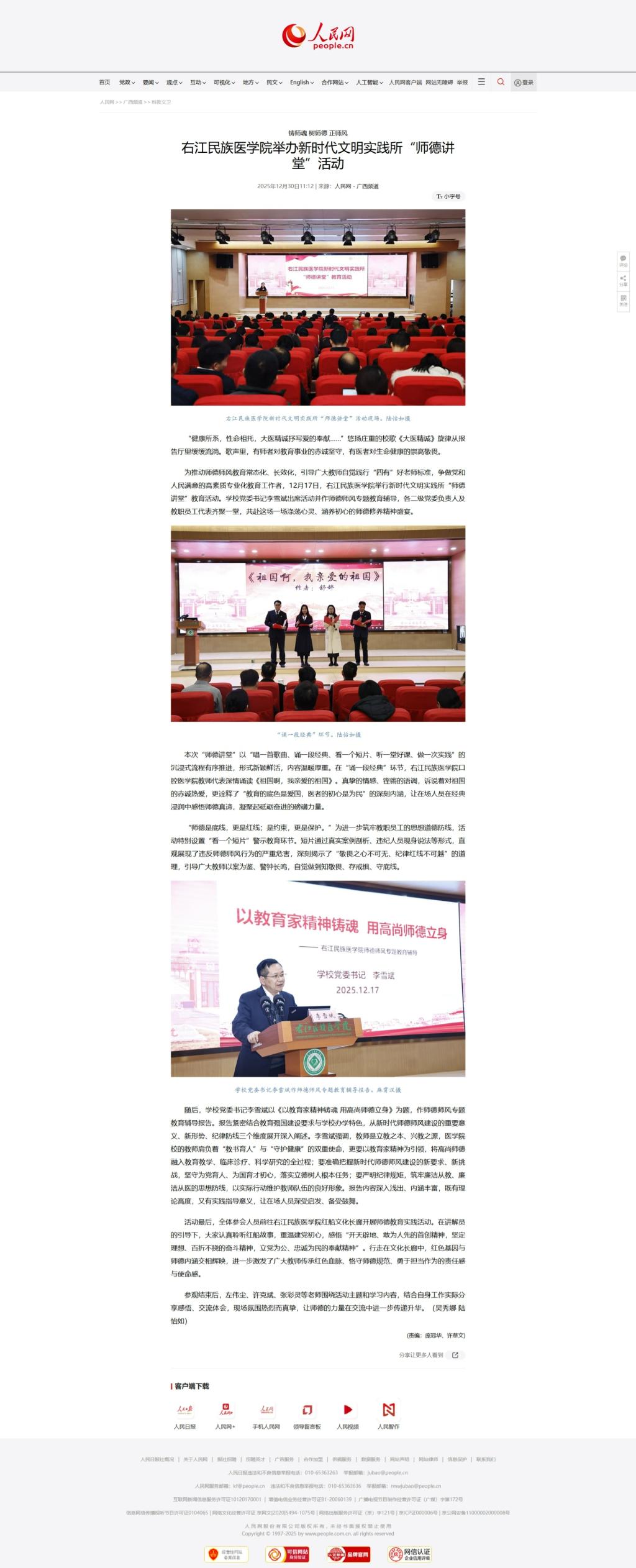 12月30日,人民网以《铸师魂 树师德 正师风 右江民族医学院举办新时代文明实践所“师德讲堂”活动》为题报道我校新时代文明实践所“师德讲堂”活动。我校“师德讲堂”活动以“唱一首歌曲、看一部短片、诵一段经典、讲一个故事、作一番点评”的“五个一”基本模式和自主创新环节的形式进行,推动师德师风建设走深走实、见行见效。
