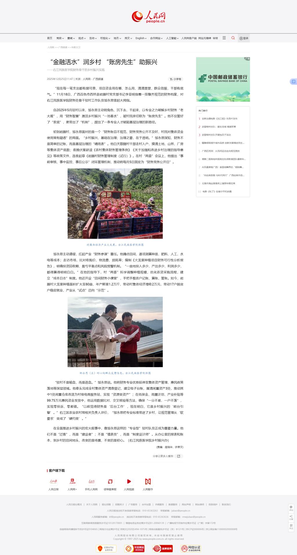 12月25日,人民网以《“金融活水”润乡村“账房先生”助振兴》为题,报道右江民族医学院驻村工作队员邹永思,从2025年5月初到百色市西林县岩腊村驻村后,主动转角色、沉下去、干起来,以财务专业之力破解乡村财务“老大难”,用“财务智慧”激活乡村振兴“一池春水”,被村民亲切称为“账房先生”。
