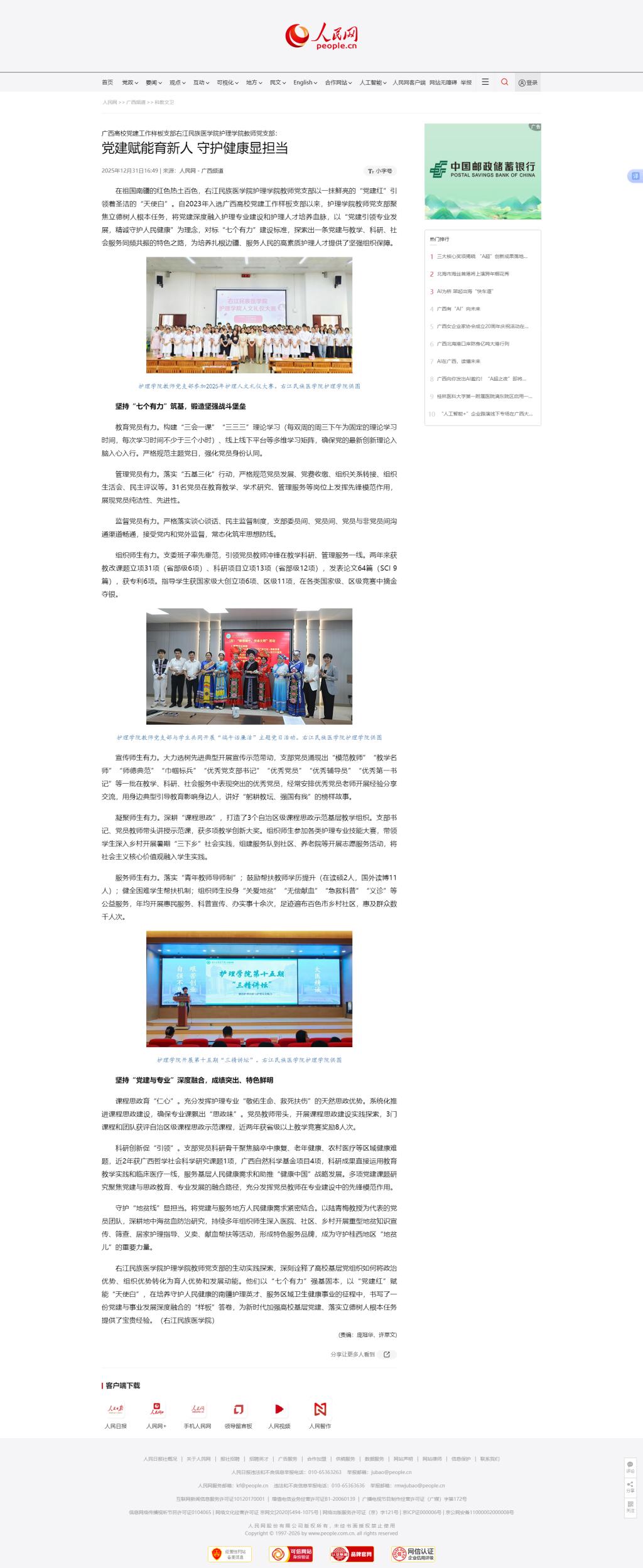 12月31日,人民网以《党建赋能育新人 守护健康显担当》为题,报道右江民族医学院护理学院教师党支部自2023年入选广西高校党建工作样板支部以来,聚焦立德树人根本任务,将党建深度融入护理专业建设和护理人才培养血脉,以“党建引领专业发展,精诚守护人民健康”为理念,对标“七个有力”建设标准,探索出一条党建与教学、科研、社会服务同频共振的特色之路,为培养扎根边疆、服务人民的高素质护理人才提供了坚强组织保障。