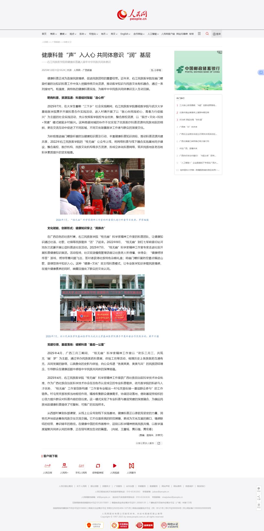 12月31日,人民网以《健康科普“声”入人心 共同体意识“润”基层》为题,报道我校在幽门螺旋杆菌防治知识科普工作中深入挖掘传统文化资源,推动医学知识与民族文化有机融合,通过一系列接地气、有温度、具特色的健康科普实践,为铸牢中华民族共同体意识注入生动注脚。