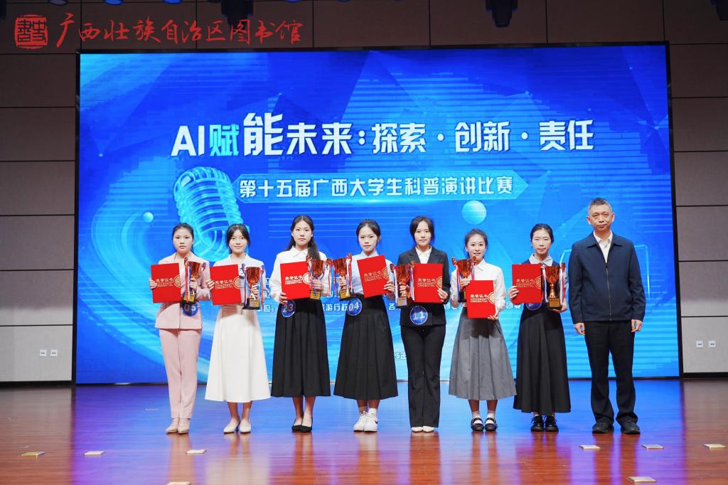 2025年12月21日上午,以“AI赋能未来:探索·创新·责任”为主题的第十五届广西大学生科普演讲比赛决赛在广西图书馆顺利举行。我校学子梁科艳凭借优异表现,在比赛中荣获三等奖。
