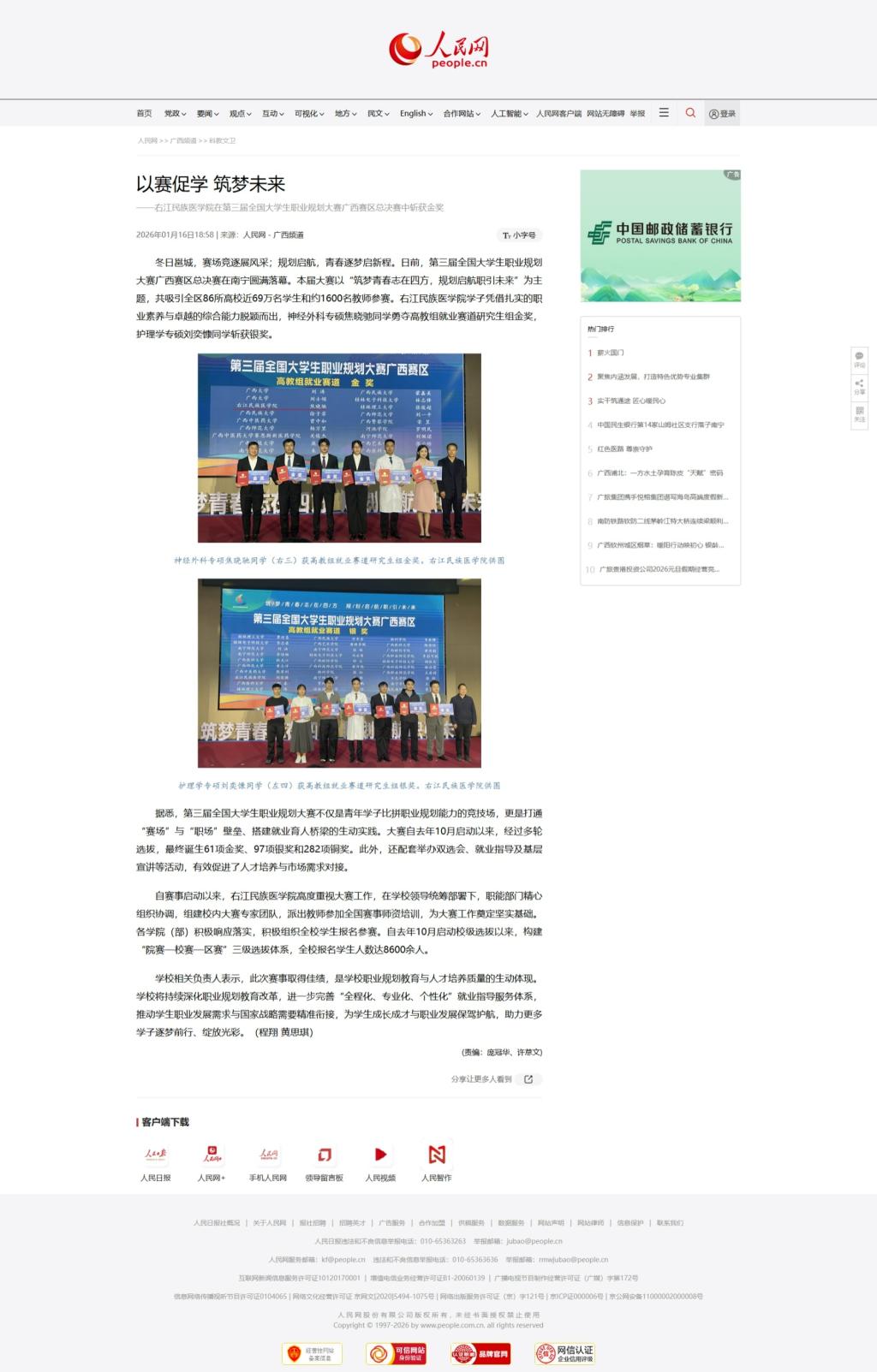 1月16日,人民网以《以赛促学 筑梦未来——右江民族医学院在第三届全国大学生职业规划大赛广西赛区总决赛中斩获金奖》为题,报道我校学子凭借扎实的职业素养与卓越的综合能力脱颖而出,在第三届全国大学生职业规划大赛广西赛区总决赛高教组就业赛道研究生组中斩获金奖。
