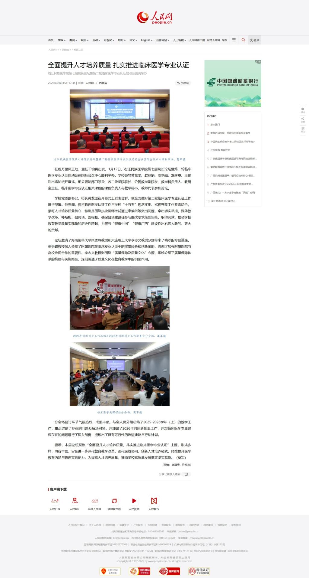 1月15日,人民网以《全面提升人才培养质量 扎实推进临床医学专业认证 右江民族医学院第七届院长论坛暨第二轮临床医学专业认证启动会圆满举办》为题,报道我校第七届院长论坛暨第二轮临床医学专业认证启动会顺利举办。