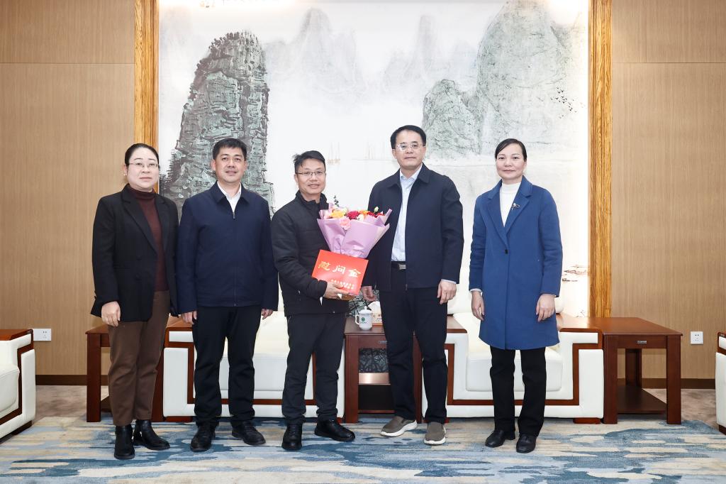 2月4日下午,在农历新春佳节即将来临之际,百色市政协副主席黄建平到我校亲切慰问农圣博士,并送上节日祝福。学校党委副书记、校长黄龙坚陪同慰问。
