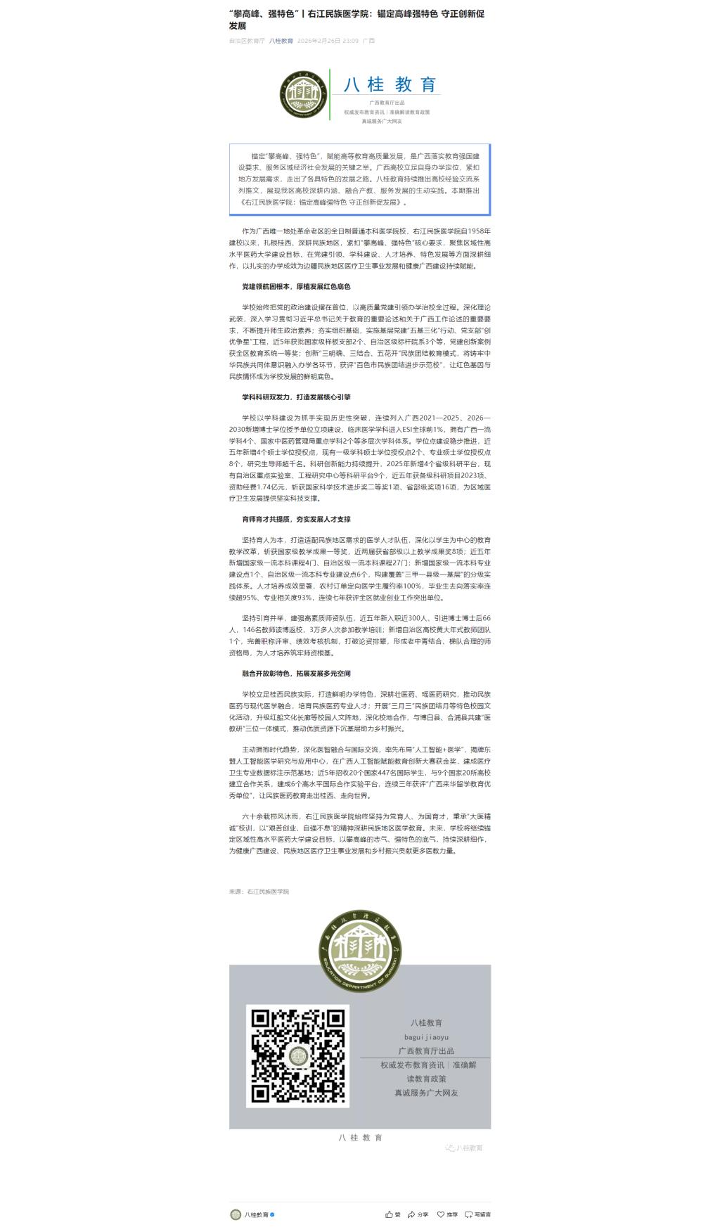 2月26日,八桂教育以《“攀高峰、强特色”丨右江民族医学院:锚定高峰强特色 守正创新促发展》为题,介绍我校扎根桂西、深耕民族地区,紧扣“攀高峰、强特色”核心要求,聚焦区域性高水平医药大学建设目标,在党建引领、学科建设、人才培养、特色发展等方面深耕细作,以扎实的办学成效为边疆民族地区医疗卫生事业发展和健康广西建设持续赋能。