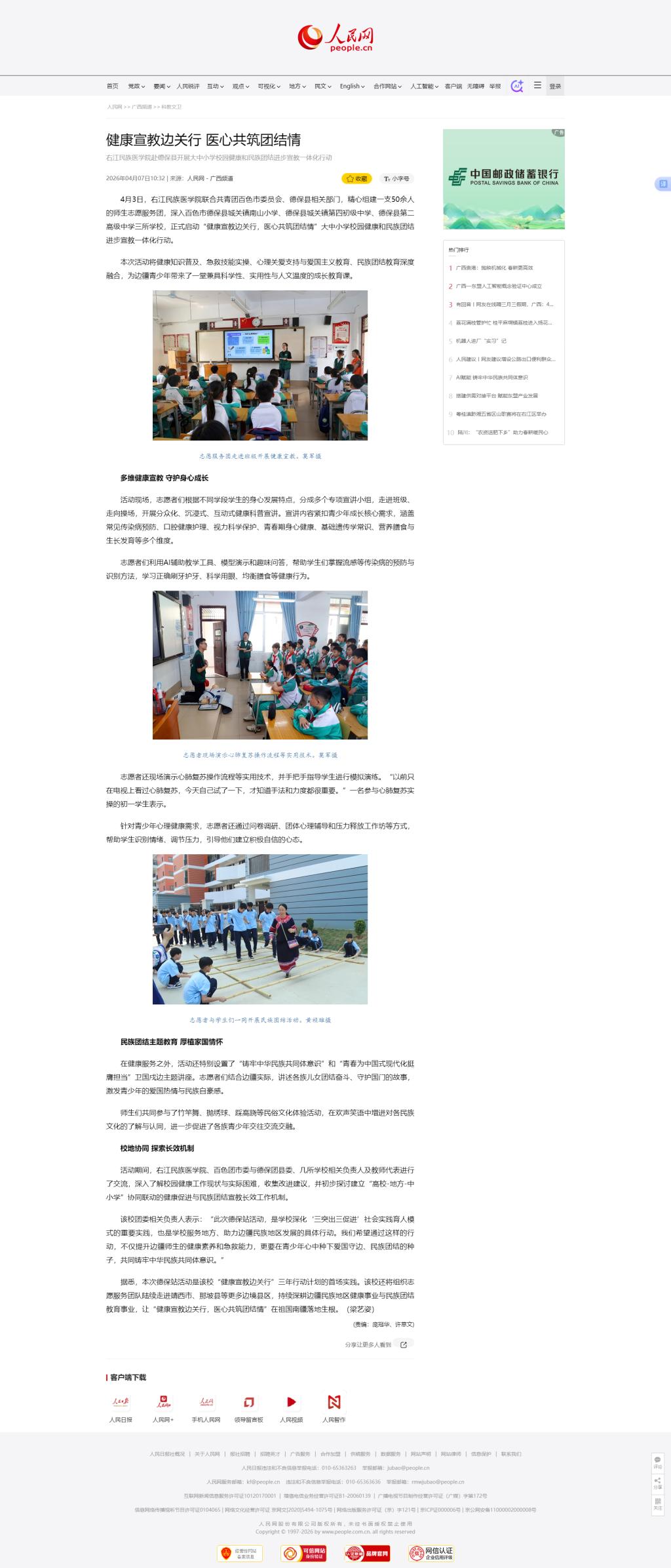 4月7日,人民网以《健康宣教边关行 医心共筑团结情》为题,报道我校师生志愿服务团赴德保县开展大中小学校园健康和民族团结进步宣教一体化行动。