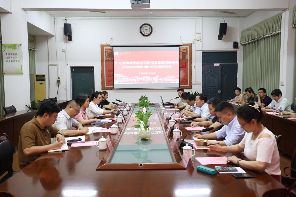 4月14日下午,百色市卫生健康委员会副主任黄丽明、百色市投资促进局副局长林杨一行莅临我校,就中药材药物作用研究方面进行调研和交流。学校党委常委、副校长谭盛葵出席座谈会,科技处、临床医学院、基础医学院、药学院等相关职能部门、二级学院负责人及中草药领域骨干教师代表参加座谈。