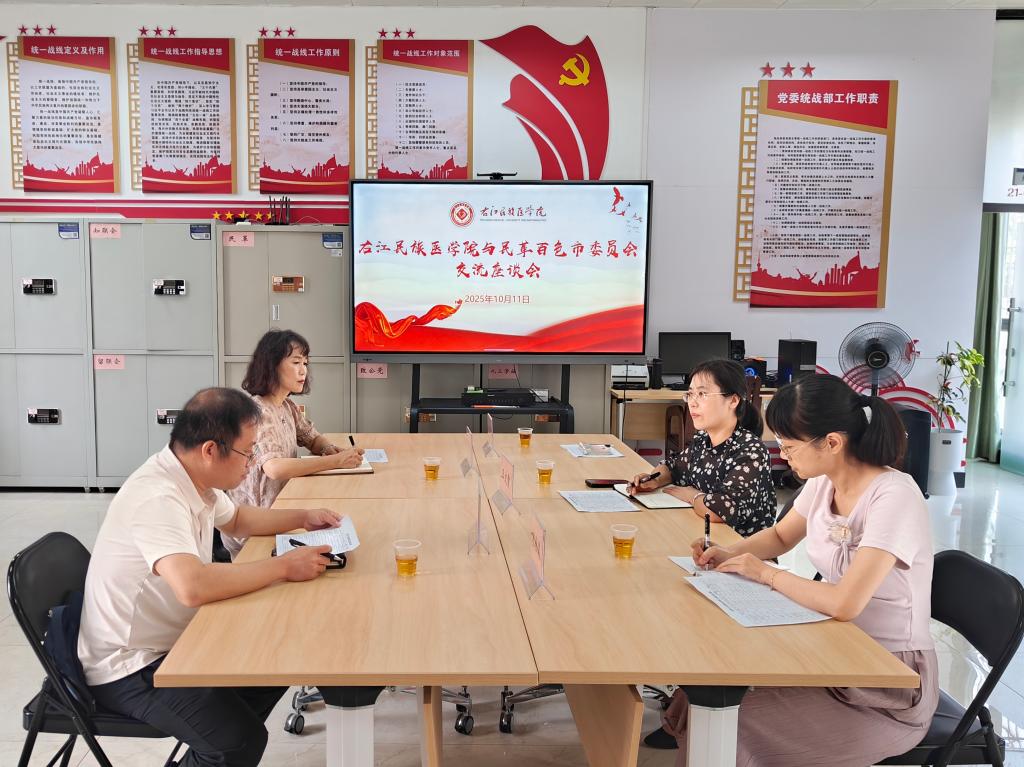 10月11日上午,右江民族医学院与中国国民党革命委员会百色市委员会(以下简称“民革百色市委会”)副主委王大理一行莅临我校开展交流座谈。会议围绕民革右江民族医学院支部(以下简称“民革右医支部”)换届工作的相关事宜进行了深入沟通与协商。学校党委办公室主任、统战部部长王文霞及统战部全体工作人员参加座谈会。