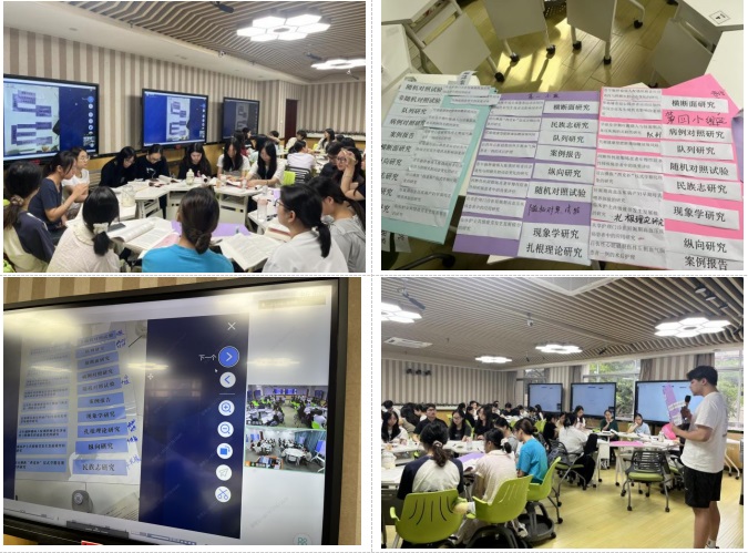 课堂活动采用“课前线上自学+课中科研设计类型分类游戏+汇报答疑”的趣味化教学流程。课前两校学生共享线上资源备课;课中由海南医科大学护理学院夏杰琼教授与右江民族医学院护理学院吕辉教授共同主导,设置两个特色游戏环节:第一轮为科研设计类型分类游戏,各小组学生按照科研设计类型分类后制成图表上传,老师通过雨课堂随机抽取了小组进行汇报,其他组补充;第二轮为科研设计应用游戏,学生为研究问题匹配合适的研究设计并制成图表上传,老师通过雨课堂随机抽取小组进行汇报,其他组分享不同观点。