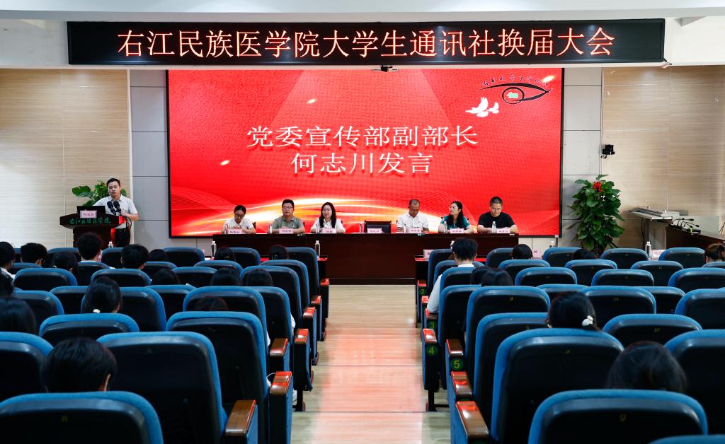 10月18日下午,右江民族医学院大学生通讯社(以下简称“大通社”)第二十三届换届大会暨表彰大会在百城校区举行。大会全面总结过去一年的工作成果,表彰表现突出的优秀工作者。党委宣传部、党委组织部教师代表,全体大通社成员,各校级组织、学生社团、二级学院记者团代表参加大会。