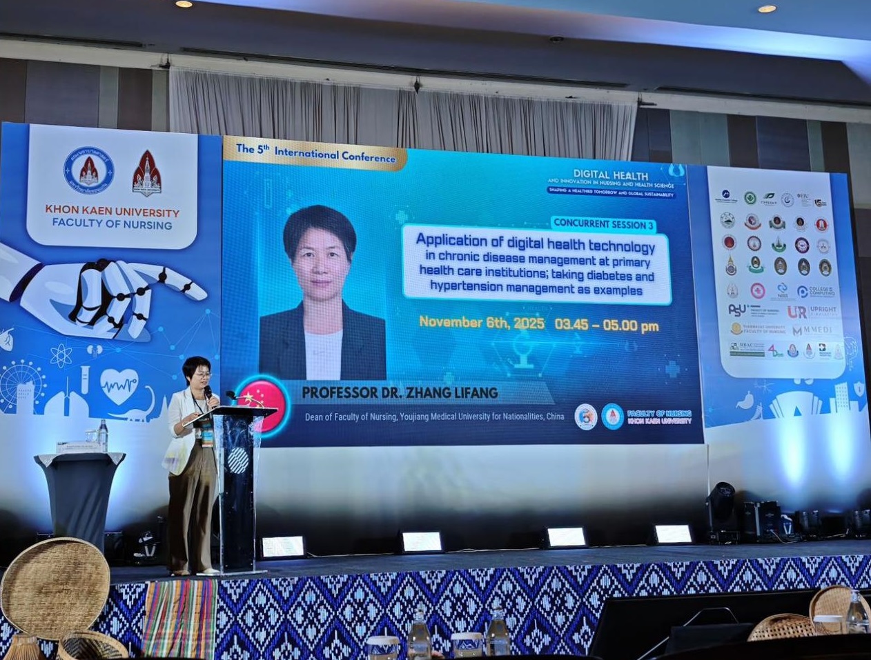 2025年11月5日至7日,第五届国际护理与健康科学数字健康与创新大会(The 5th International conference Digital Health and Innovation in Nursing and Health Science)在泰国孔敬隆重召开,大会以“塑造更健康的明天和全球可持续发展(Shaping a Healthier Tomorrow and Global Sustainability)”为主题。我校是本次会议的合作单位之一。护理学院院长张莉芳教授一行五人代表团出席会议,并在多个环节发出“右医声音”。