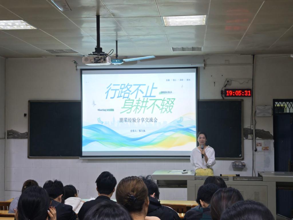 在“考研深造策略与方法”分享环节,侯万凤从目标定位、备考规划与心态调整三个方面展开系统讲解。她指出,选择目标院校与专业时,应兼顾“实力匹配度”与“发展适配性”,并结合自身备考经历作了详细说明。此外,她提醒同学们要重视心态管理、学会科学减压、保持规律作息、稳扎稳打地推进复习进程。