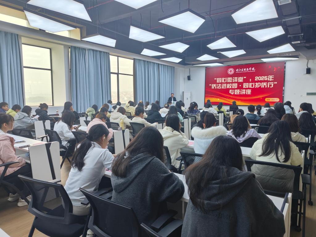 为深入学习贯彻习近平法治思想,纪念《中华人民共和国归侨侨眷权益保护法》颁布35周年,切实增强青年学子对侨务法律法规的认识与理解,12月12日上午,由广西侨联主办,百色市归国华侨联合会、右江民族医学院承办的“同心微讲堂”活动暨2025年“侨法进校园·同心护侨行”专题讲座在我校百东校区东盟创新创业中心路演学术厅举行。百色市法律援助中心主任黄滟晴担任主讲嘉宾,各二级学院的学生代表参加活动。