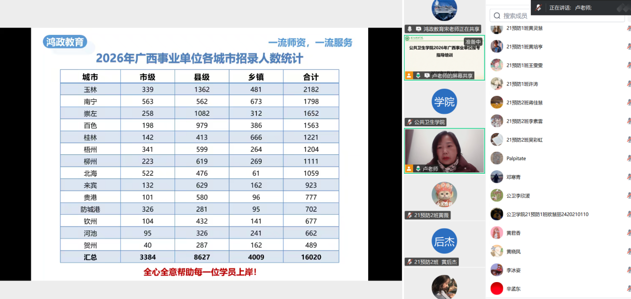 1月26日晚,公共卫生学院通过腾讯会议举办了一场针对性强、内容丰富的毕业生就业指导专题会议。会议特邀鸿政教育宋秉桂老师,围绕广西区考与事业编考试的报考条件、岗位筛选、竞争态势及备考技巧等核心内容展开针对性指导。会上,辅导员老师同步解读了学校“寒假促就业暖心行动” 五大行动体系,即岗位推送、资源拓展、求职指导、困难帮扶及实习就业衔接等服务。