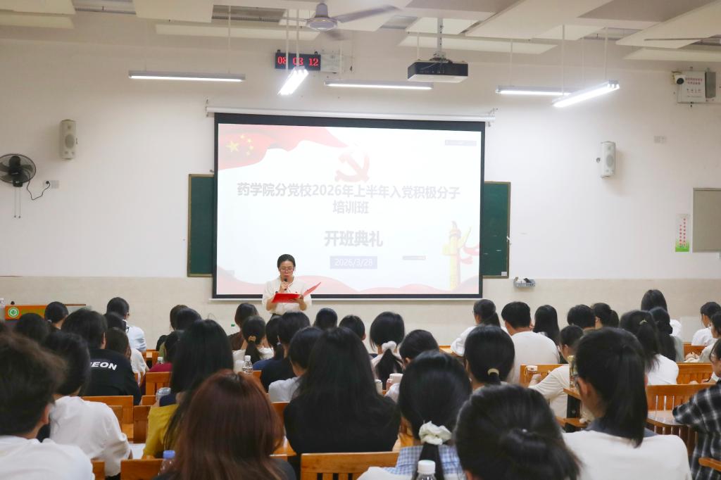 在开班仪式上,药学院党委副书记文志娟作动员讲话并致辞,对学员们提出了明确要求与殷切期望。她希望预备党员要将理论学深悟透、把党性锤炼过硬,坚定信念跟党走,精研专业强本领,以专业守护药品安全生命线,在学习、科研、志愿服务中主动亮明党员身份、勇担时代责任。入党积极分子要以党史为镜、以药德为基,进一步坚定理想信念、端正入党动机,从党史中汲取信仰力量,将红色精神融入药学专业学习与事业追求,不断加强思想淬炼与实践锻炼,争取早日成长为政治合格、作风过硬、业务精湛的共产党员。