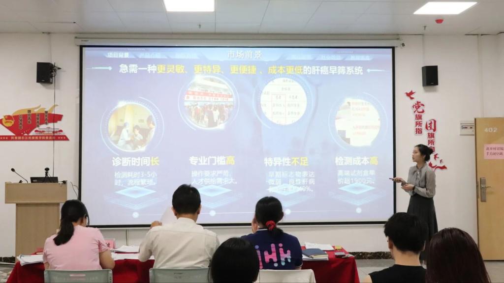 自选拔赛自启动以来,经过团队自行申报、二级学院推报、学校团委组织评审,最终有35支团队进入线下路演环节。在路演环节中,各团队分别从项目背景、核心技术、商业模式、项目应用及社会价值等方面,以PPT等多媒体形式进行汇报。选手们表达流畅、逻辑清晰,能够将项目与医学专业特色、人工智能发展趋势相结合,展现出扎实的学术积累与创新意识。