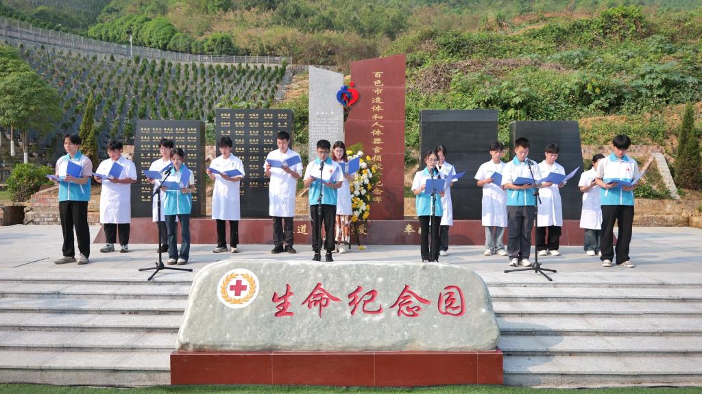 为深刻缅怀遗体和人体器官捐赠者的无私奉献精神,弘扬正能量,倡导新风尚,扎实推进“三生三信”教育(探究生命奥秘、守护生命健康、追求生命价值、从医信念、职业信守、人生信仰)走深走实,近日,百色市红十字会、市民政局、市卫生健康委员会联合右江民族医学院基础医学院,在百福生态陵园共同举办2026年百色市人体器官捐献者缅怀纪念活动。基础医学院学生代表参加本次活动,以诗朗诵的形式向“生命使者”致以崇高敬意。