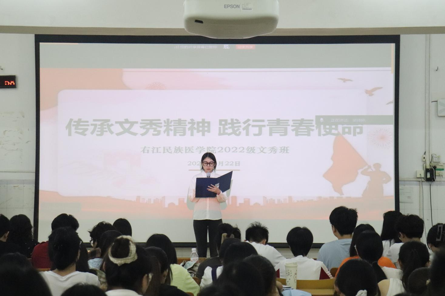 在宣讲中,文秀班田艳飞同学系统解读了“不忘初心、勇于担当、心系群众、脚踏实地”的文秀精神内涵,展示了文秀班自成立以来在思想引领、志愿服务、社会实践等方面取得的丰硕成果。通过一幅幅生动的图片、一组组扎实的数据,展现了新时代大学生传承红色基因、服务基层群众的青春风采,为在场的同学们树立了榜样。全体同学还共同观看了影片《秀美人生》,在光影中重温了黄文秀同志用美好青春诠释初心使命的感人事迹。
